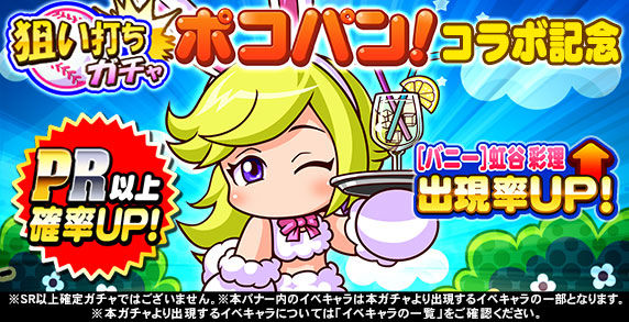 通常のレアガチャにおけるその他のイベキャラの出現率と比較して、各レアリティ内における「[バニー]虹谷 彩理」の出現率がアップ!