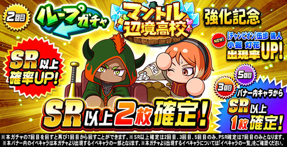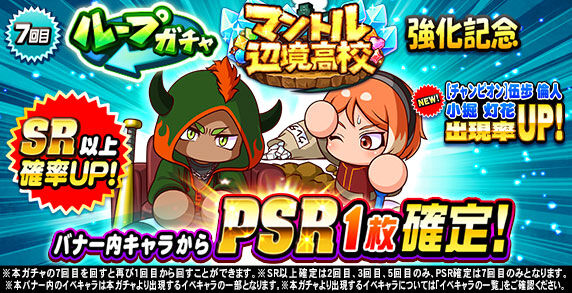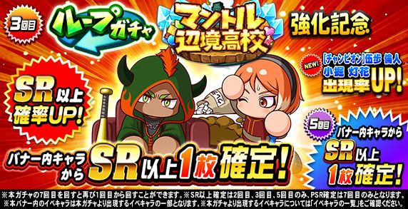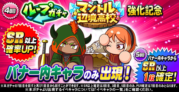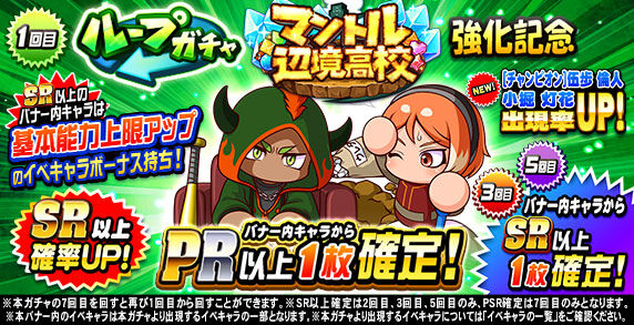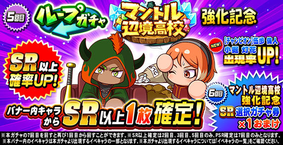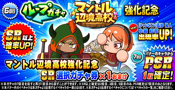 キャンペーン期間中「ループガチャ マントル辺境高校強化記念(10連ガチャ)」の6回目を回すと、 「SR」の特定のイベキャラを選択して獲得できる 「マントル辺境高校強化記念SR選択ガチャ券×1」がおまけとしてついてくるぞ!